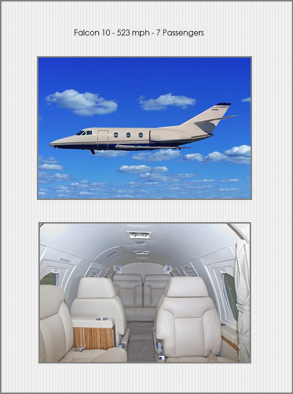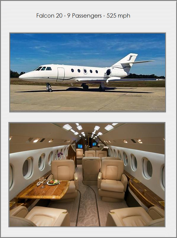 Lear Jet 35, Falcon 10 Jet, Falcon 20 Jet, Beech King Air, Cessna 401, Cessna 310, Piper Navajo, Saab 340, Cessna Conquest and other jet charters