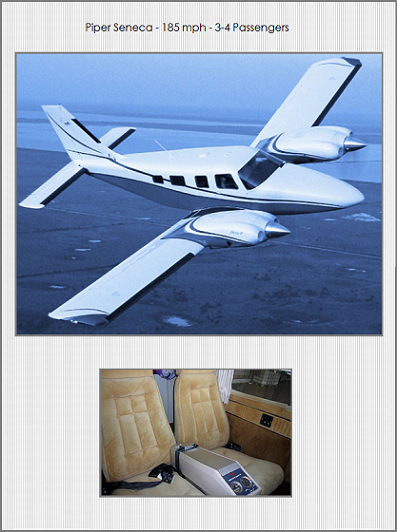 PIPER SENECA $ - The Piper Seneca can carry 3-4 people and travels 190 mph. Great for shorter trips with a smaller group. view image